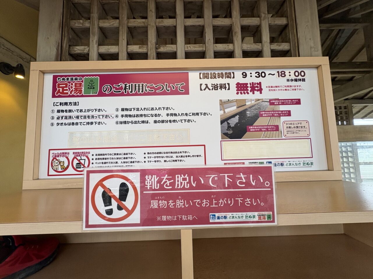 「たぬま温泉の足湯」は9時30分から18時まで開設しています。入浴料は無料! タオルは持参するか、また売店でもタオル販売をしているので安心して利用できます。