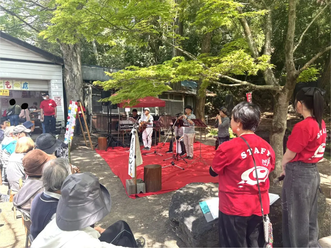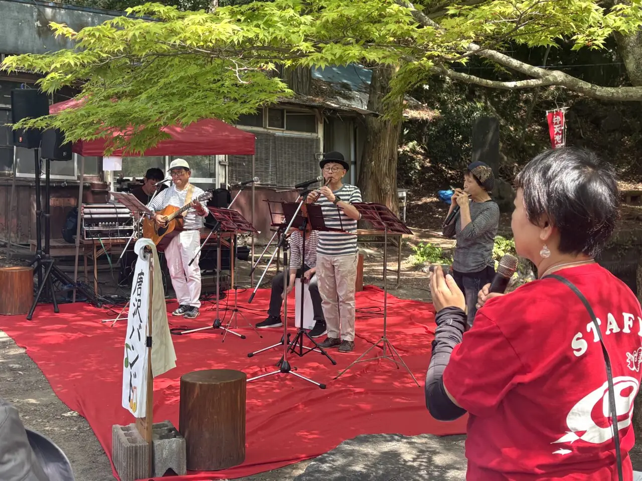 ステージ前の椅子、近くのベンチは満席で立ち見の方がずらりと、大いに盛り上がっています。