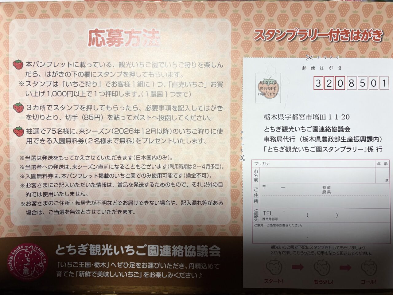 ① パンフレットに載っている「観光いちご園」でいちご狩りやお買い物を楽しんだら、応募はがきの下の欄にスタンプを押してもらいます。